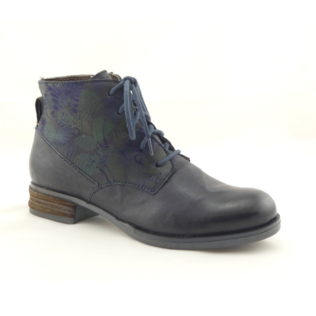 Sanja 10 in a beautiful navy combo is an ankle boot with a difference. The plain leather front upper and floral pattern around the ankle, makes it a striking little boot set to impress. Tee it up with straight legged jeans and a self coloured top in white or blue tones to make a statement. Perfectly appropriate for the office as it is for the weekend.